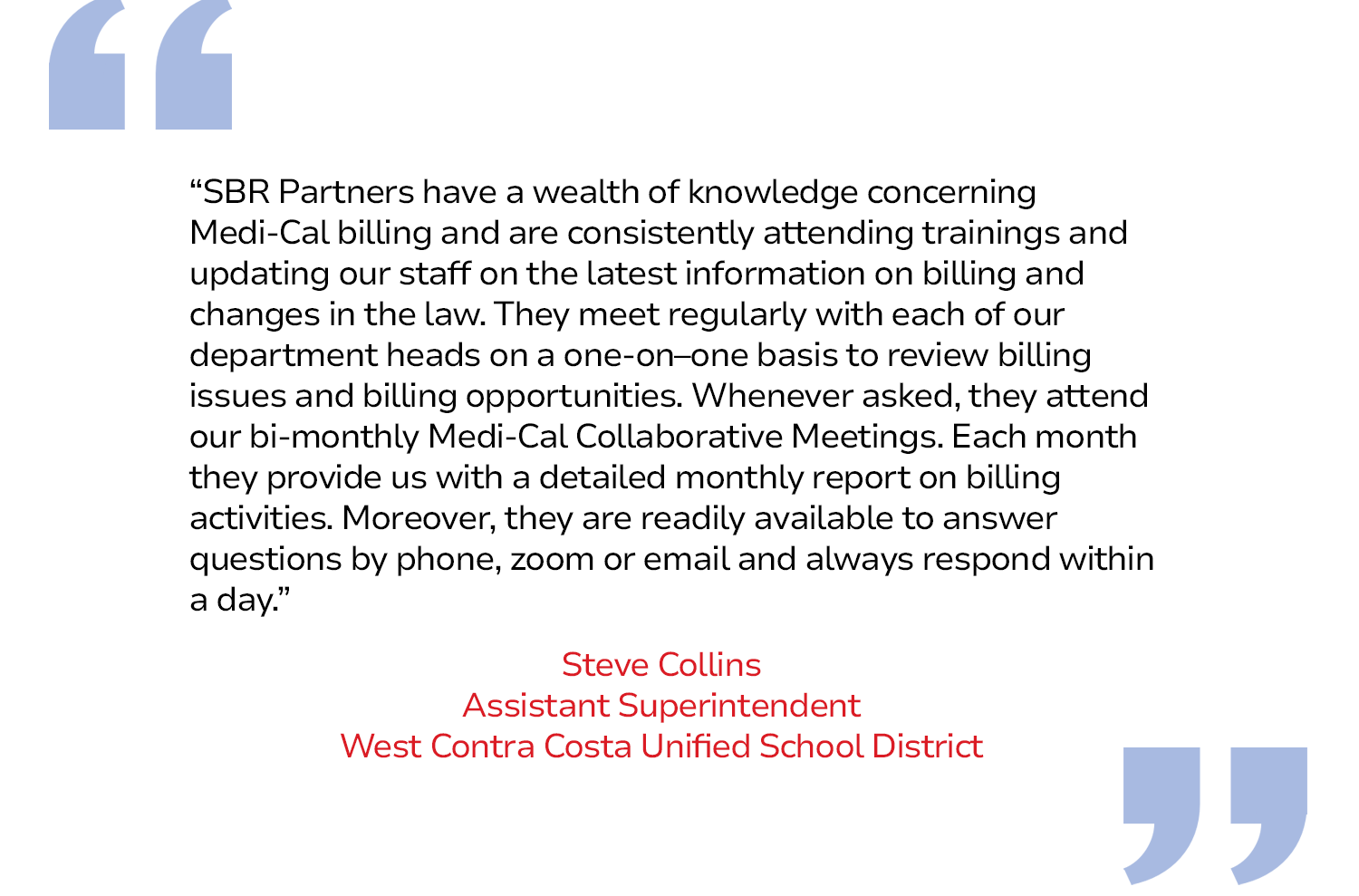 SBR’s business model guarantees that our level of customer service is at its best, by keeping a low client to Account Manager ratio. Our goal is for every one of our clients to participate in Medi-Cal reimbursement programs to the best of their ability with the greatest amount of ease.